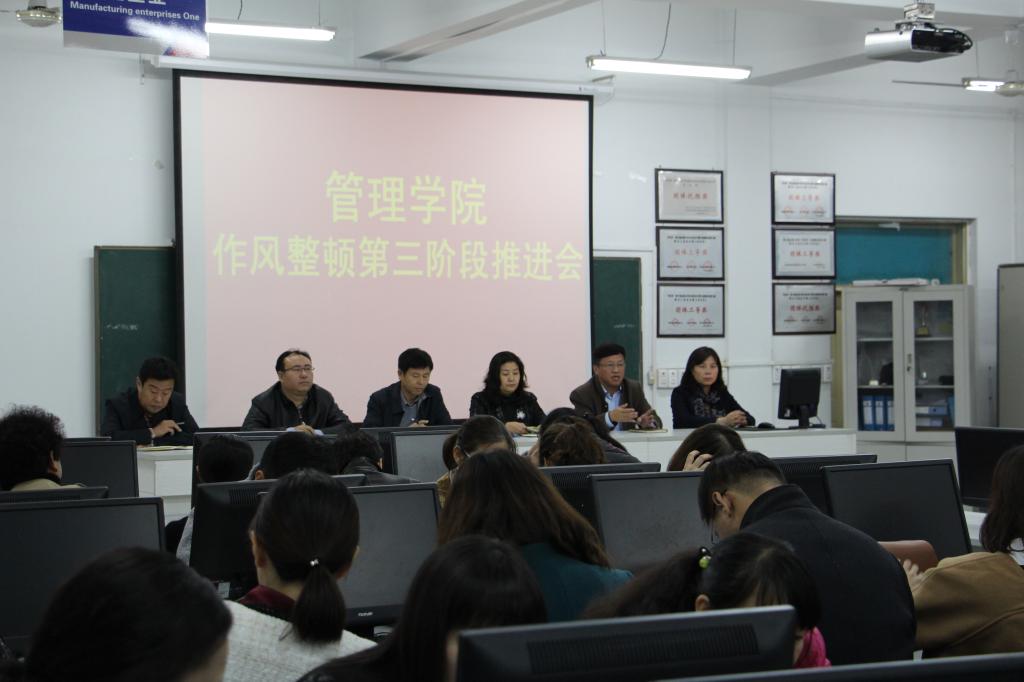 为进一步推动作风整顿工作深入开展,落实学校作风整顿第三阶段工作推进会议精神,管理学院于10月17日召开了作风整顿第三阶段布置暨工作流程再造推进会,10月18日召开了全院作风整顿工作第三阶段工作推进会。