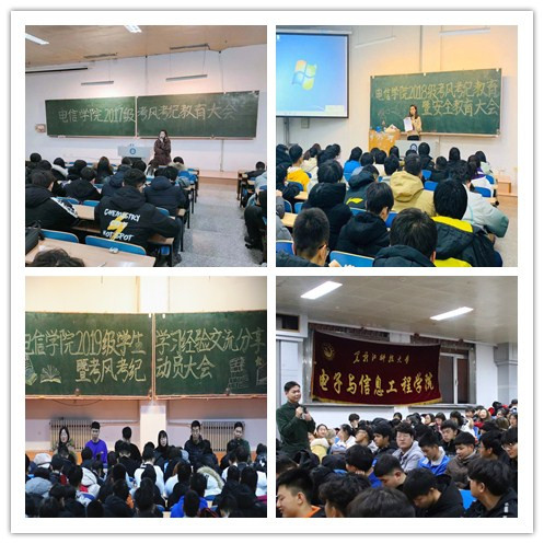 为切实加强学风建设,培养学生养成诚实守信的道德品质,树立勤奋严谨的求学精神,营造良好的学习氛围,教育引导学生做好四六级考试、期末考试的复习备考。电信学院于12月12日、13日分年级召开了考风考级教育暨学生安全教育大会。电信学院辅导员陆冠楠、刘赢、孙曼、王宗宇参加教育大会。