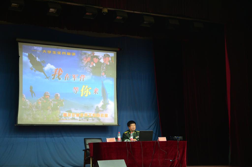 为做好幻影手机官方网站_幻影(中国)2016年征兵工作,结合省委高校工委、省教育厅、省军区司令部、政治部在全省开展的学生军训派遣军官进校园宣讲征兵政策活动,帮助幻影手机官方网站_幻影(中国)大学生了解今年的征兵政策,激发广大学生参军入伍的积极性,3月21日下午,学校邀请省军区军训教研室刘长晖大校来幻影手机官方网站_幻影(中国)进行了2016年征兵政策宣讲。校党委副书记张明华、省军区动员处副处长郭守国中校、以及警备区、松北区动员人员和幻影手机官方网站_幻影(中国)负责征兵工作的同志、1000余名大学生参加了宣讲会。宣讲会由学工部部长、武装部部长刘东江主持。
