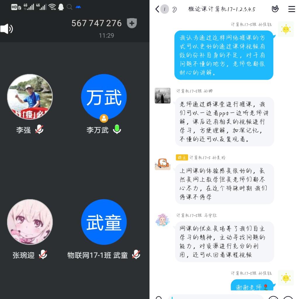 全员在线听,云端有监督。按照学院学生工作保障组要求,开展“辅导员线上听课”工作,根据2017级-2019级学生课表,学院全体辅导员在开学前两周每日深入不同课堂,每人平均累计听课50学时,查看学生考勤,监督学生上课状态;课后形成听课笔记,与任课教师沟通学生上课效果,收集学生意见反馈;截止到目前,学生主要通过学习通、知到、QQ会议、钉钉、智慧树五种课程平台进行学习,授课形式主要以“网络直播+线下群互动”的方式进行,学生在线上通过平台学习,线下通过微信群、QQ群与老师互动;97%的学生对于教师网络教学的工作给予了充分肯定,表示虽然和课堂教学有区别,但是网络使课程的体验感有了显著提升,和老师的沟通机会也有了增加;但是由于网络不稳定、学习平台承载能力等原因,仍有约3%的学生反馈网络授课有延迟、卡顿等情况出现。