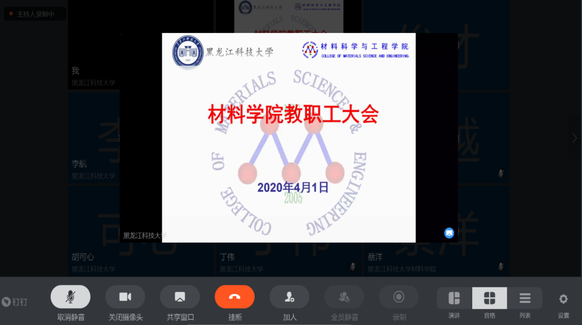 为一步保障疫情期间各项工作的稳步进行,材料学院于4月1日下午利用钉钉网络平台召开全院教职工视频网络会议,会议由教学副院长王永东主持。