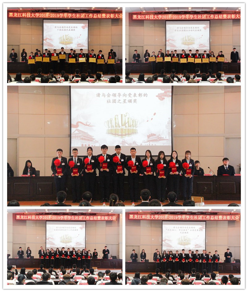 会上,校团委社团管理部部长徐龙作了题为《不忘初心 砥砺奋进 在实现中国梦的宏伟征程上汇聚起社团青年的磅礴力量》的2018-2019学年学生社团工作报告;校团委副书记马紫微宣读了《关于表彰2018-2019学年“十佳社团”、“学生社团精品活动”、“社团之星”、“社团活动先进个人”的决定》;与会领导和老师向受表彰的获奖代表颁发了获奖证书;“十佳社团”代表、英语俱乐部会长施宇,“社团精品活动”代表、研究生与本科生联谊会副主席曹敬研,“社团之星”代表、电气学院大学生科技协会主席张强3位同学分别作了典型经验交流。
