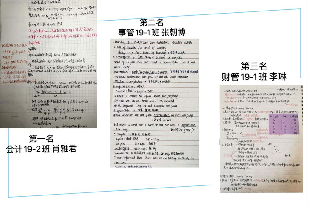 此次评选面向管理学院2019级全体同学,初赛由分别从三个方面对参评同学笔记进行考量,查看必学内容是否学习到位的学习进度、笔记书写字迹是否工整的学习态度、个人思考逻辑撰写的学习深度。精心筛选出25份作品进入终选阶段,本着公平、公正、公开的原则将优秀笔记在微信公众平台进行为期三天的大众评审投票比拼。笔记字字珠玑,篇篇行云流水,“好记性不如烂笔头”,整理笔记的过程更是梳理巩固知识得道前行的阶梯。经激烈角逐,会计19-2班肖雅君的笔记重点突出、条理清楚、字迹娟秀,荣获“最美网课笔记”第一名;事管19-1班张朝博的全英笔记、版面整洁,荣获“最美网课笔记”第二名;财管19-1班李琳的笔记图文并茂、形象清晰,荣获“最美网课笔记”第三名,其他优秀笔记也通过精美视频在公众号中进行展示。