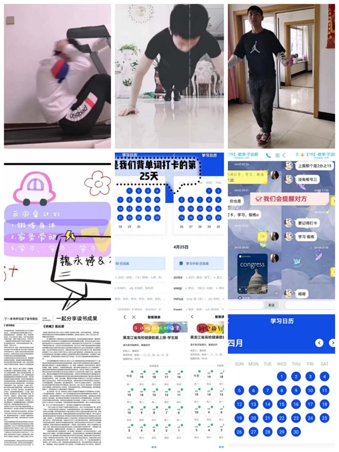 组织“云端”竞技,营造良好学风。为调动学生“宅家学习”的积极性,我院搭建线上风采展示平台,共同营造良好学习氛围。自4月1日活动开展以来,得到了学生们的积极响应,激发了学生们“比、学、赶、超”的学习劲头。开展云端课堂“硬核”笔记展活动,4月17日开始在学院团委公众号平台以数学系、力学系、物理系以及统计系的顺序展出;开展摘录书香气,“云阅读”活动,每人共摘录不少于100句,通过此项活动使学生们在居家阅读中增长知识,坚定文化自信;开展“词”不迟到,百词斩30天打卡活动。此活动覆盖面广,学生热情度高,参与人数达300余人;开展“居家学习,健体怡情”网上活动,为了将德、智、体、美、劳“五育”有机结合,丰富学生们疫情防控期间居家文化生活,养成健康积极的生活方式,学院举办了以“云健康”为主题的创新形式活动,主要形式有仰卧起坐、深蹲运动、俯卧撑、跳绳以及平板支撑等。