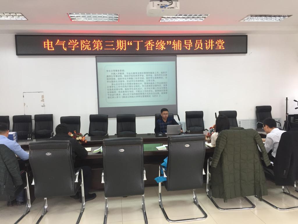 为持续推进“不忘初心、牢记使命”主题教育,夯实学生工作基础,筑牢辅导员队伍建设,提升辅导员在日常事务管理中业务水平,11月11日,电气学院在学院五楼会议室举办了第三期“丁香缘”辅导员讲堂,电气学院辅导员郑红岩担任主讲,全体辅导员参加,讲堂由学院党委副书记宋玉彬主持。