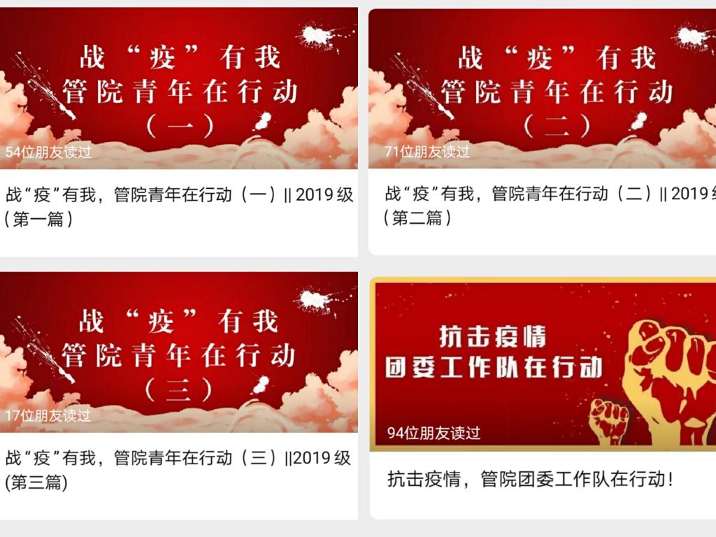 ——占好宣传“主阵地”,筑牢防控舆论线。为坚决落实团中央、校团委的相关文件精神,管理学院团委第一时间组织团学组织密切关注新型冠状病毒感染的肺炎疫情防控形势变化,及时掌握信息,充分利用官方微博、微信等新媒体平台,加大宣传力度、频次和覆盖面,构建全方位、全覆盖、全天候宣传矩阵,大力宣传疫情防控工作部署安排和防控知识,在官方平台发布多篇推文,及时推送有关疫情的最新通知,引导学生科学有效防控。其中,通过微信公众号推送的“疫情防控,管院青年在行动”系列推文受到一致好评。学院团委积极倡导全院青年“不信谣、不传谣”,“不返校,不离家”,形成“院团委—团支书—青年团员”的三级舆情管控体系,并建立24小时反馈通道,以便及时发现问题,解决问题,使各项疫情防控工作在线上扎实有效进行。