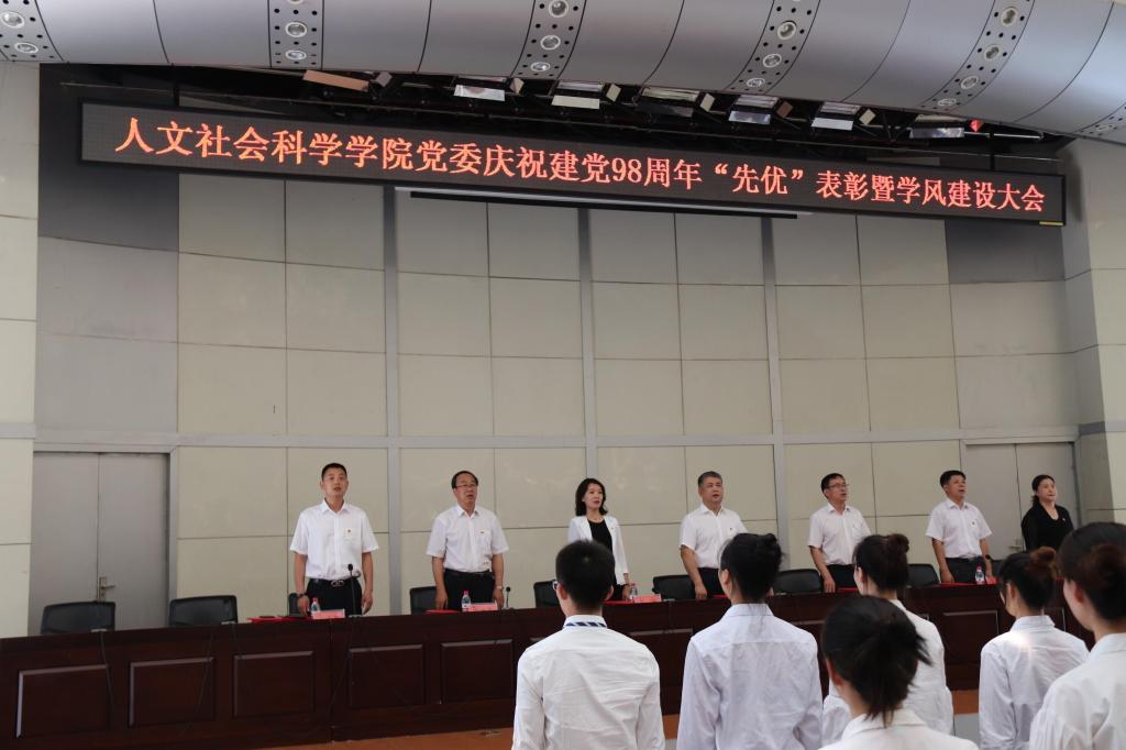 6月26日,人文社会科学学院党委在信息楼报告厅召开庆祝建党98周年“先优”表彰暨推进学风建设大会。校党委组织部副部长、机关党委书记、党校常务副校长唐立国,校党委学工部部长、学生处处长薛立刚,校党委学工部副部长、团委副书记苗雨,人文社会科学学院党委书记陈连军、院长张建华、副院长张元洪,全体教师及学生代表出席大会。会议由正处级辅导员王伟强主持。