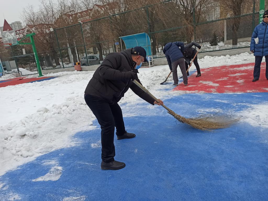 为了给返校归来大学生提供更多健身活动场地。3月2日、3日,体育部全体教职工在寒风中清理户外篮球场地2片。