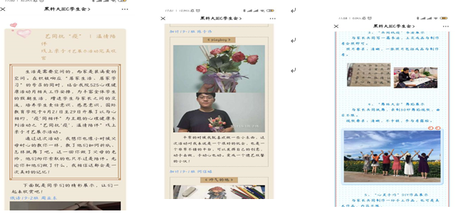为积极响应“停课不停学”的号召,丰富疫情期间学生们的宅家生活,增强学生与家长之间的情感交流,学院于4月21日——27日开展了艺同抗“疫”,温情陪伴线上才艺展示活动,同学们从生活点滴出发,结合自己的生活兴趣爱好,用镜头记录了与父母一起宅家的精彩生活。在这个“加长版”的假期里,通过与父母共同进行线上才艺展示,更进一步拉近了与父母的“距离”,使同学们在居家学习生活中能够发现生活之美,学会感恩、学会分享。