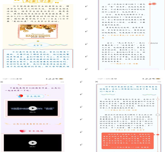 为丰富疫情期间学生们的居家生活,分享生活中的美好与温暖,传递爱的温度,于4月13日—20日期间开展了“爱的味道”线上美食分享活动。同学们满怀对生活的热爱、对父母的感恩,做出一道道精致的美食,看着父母品尝着美食,分享心得,爱的味道透过屏幕发散在每一个同学心中。此次活动的开展,不仅丰富了同学们居家“抗疫”课余生活,缓解了压力,也增进了父母家人的情感。