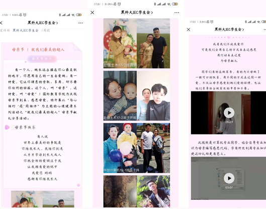 母亲节来临之际,为感恩母爱,学院开展了 “致我们最美的超人”—母亲节献礼分享活动。同学们以“画”传情、以信寄情、用爱陪伴,告白最美的妈妈。同学们以特殊的方式带妈妈“重返”青春,通过小时候与现在父母照片对比,表达对妈妈的养育之恩及对妈妈深深的感谢与美好祝福,并利用所学专业通过计算机编程代码等方式感恩母亲,回馈母爱。此次活动的开展,同学们纷纷表示唤起了他们埋藏内心深处的感恩情怀,感激母亲在自己成才路上的陪伴与呵护。