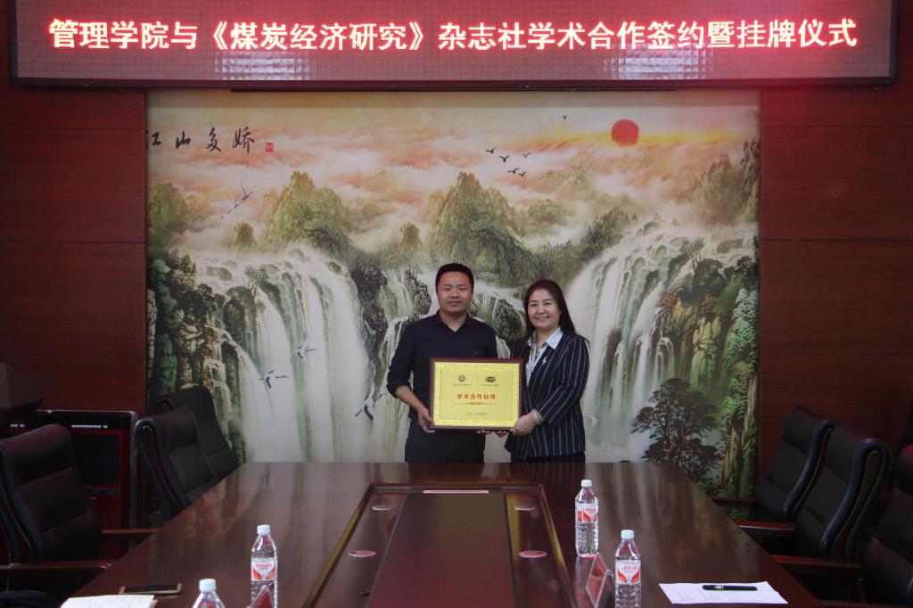 5月17日下午,管理学院与《煤炭经济研究》杂志社学术合作签约揭牌仪式在管理学院三楼会议室举行。《煤炭经济研究》杂志社副主编辑李修东、新媒体中心主任宋晓波,管理学院院长谭旭红、副院长陈培友、崔清泉以及管理学院部分学术骨干教师。签约仪式由陈培友主持。