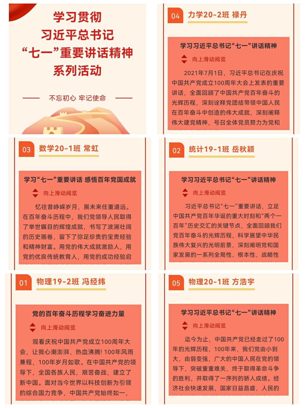 为深入学习贯彻习近平总书记在庆祝中国共产党成立100周年大会上的重要讲话精神,推进党史教育在青年学生中见实见效,引导学生领会精神实质、感悟思想伟力、坚定理想信念,理学院团学组织用大学生喜闻乐见的方式开展了“学党史 感伟力 坚信念”暨学习贯彻习近平总书记“七一”重要讲话精神系列活动。