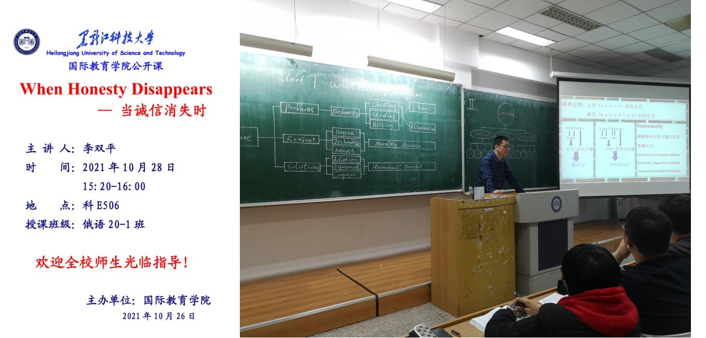 为了提高青年教师教学能力,为教师互相交流学习提供更多平台,10月28日下午国际教育学院英语教研室李双平老师在科E506开展公开课,所授课程为俄语专业《第二外国语》,授课内容为题目为《When Honesty Disappears》。