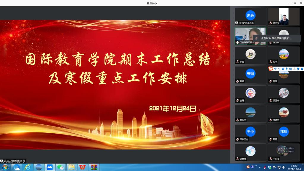 2021年12月24日下午2点,国际教育学院通过腾讯会议召开了期末工作总结及寒假重点工作安排会议,会议由院长母丽华主持,学院全体教师参加了会议。