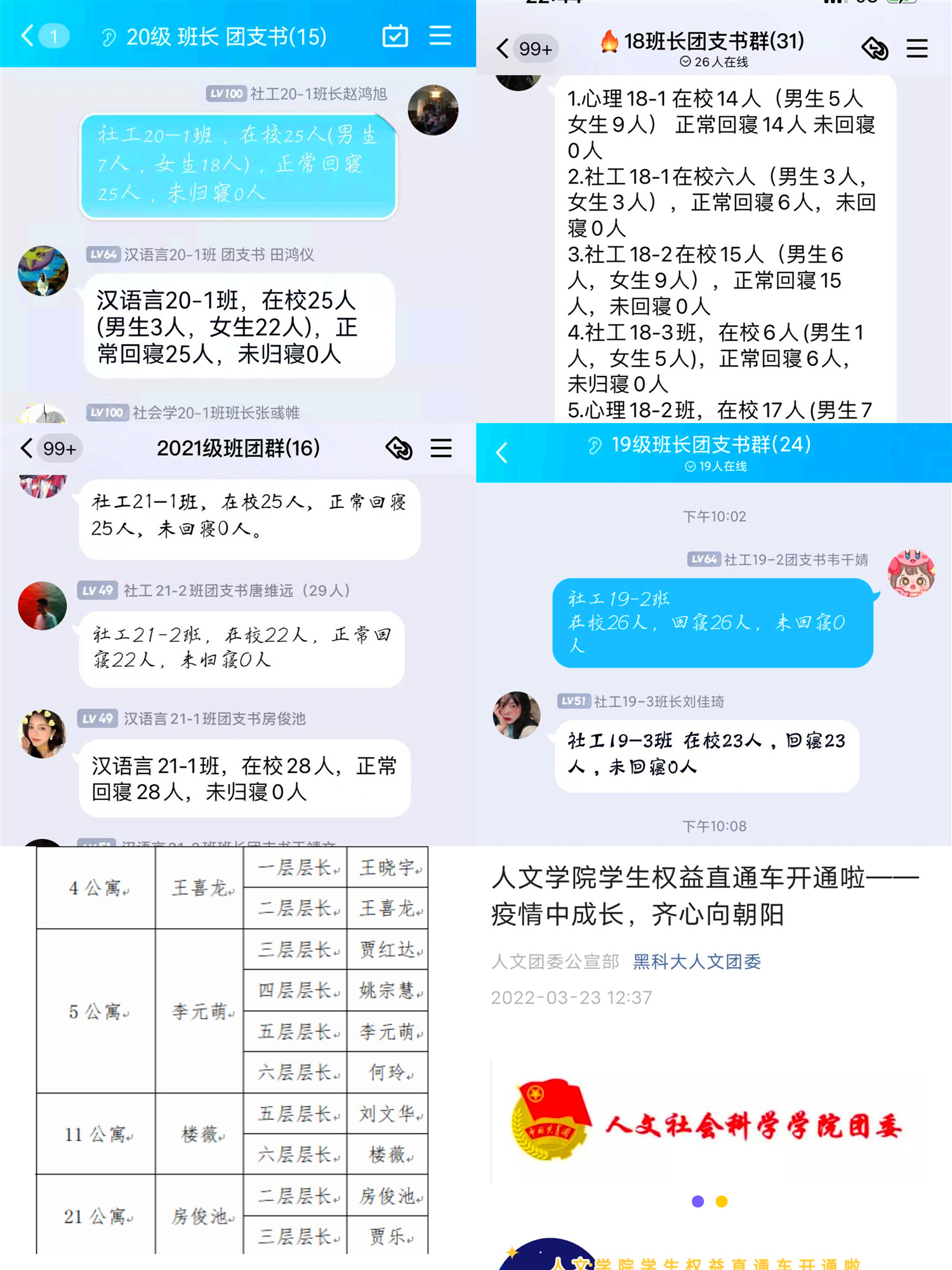 发挥学生会、自律委员会自我管理作用。充分吸纳各班级学生干部、学生宿舍长、普通学生加入工作队伍,学生干部分工负责,深入学生寝室,传达校园静态管理期间学生管理规定,帮助学生认识到此次疫情的严峻性,充分了解疫情防控的重要性,引领在校学生全力配合学校的各项防疫措施和工作安排。畅通线上、线下反馈渠道,开通人文学院学生权益反馈直通车,为学生反映校园内学习、生活等方面困难搭建平台。