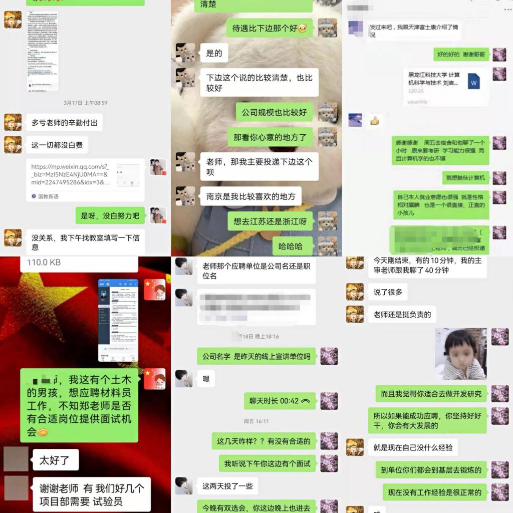 为做到对学生负责,对用人单位负责,加深与学生之间的交流沟通。学工办全体成员每天与未就业学生电话沟通、走访寝室,每天主动深入学生寝室与学生面对面交流,对未就业学生和重点群体毕业生有针对性地开展就业服务工作,做到“不就业、常跟踪”,以朋友的身份给予学生关心与关爱。“用心”“用情”“用力”推进就业工作,不断提升学院就业服务质量;党委副书记徐海英向学生多角度推送用人单位信息、全方位联系招就处、向用人单位推荐等形式,为学生提供针对性强的企业和岗位信息,保证快速将用人单位的需求与学生的就业意愿进行有效对接;通过微信群发布就业招聘信息、就业指导信息,积极引导毕业生参加就业技能培训、网络面试等。通过开展“线上简历修改”和“一对一辅导”活动,围绕“行业发展、职业规划、求职心理、简历制作、面试准备”等内容,以线上、线下的形式搭建起有针对性的服务框架,辅导员与毕业生一对一指导,解答个性化的就业问题,缓解求职心理压力,精准助力毕业生求职。