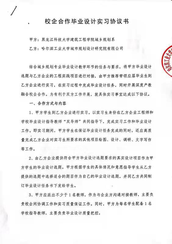 城乡规划专业延续2021年产教融合毕业设计的成功模式,2022年与哈尔滨工业大学城市规划设计研究院有限公司、黑龙江拓维城乡规划设计有限公司、哈尔滨方舟城市规划设计有限公司等7家企业深入合作,将毕业设计选题与设计院实际项目相结合,确保学生的毕业设计选题100%均为设计院真题,真题真做。通过毕业设计中的产教融合,学生在设计实践中不仅夯实了理论知识,更是锻炼了沟通协调能力和解决实际问题的能力,在真题真做的工程实践中获得了成就感、价值感和专业认同感,成为城乡规划专业实现全程育人、全方位育人的重要组成部分。