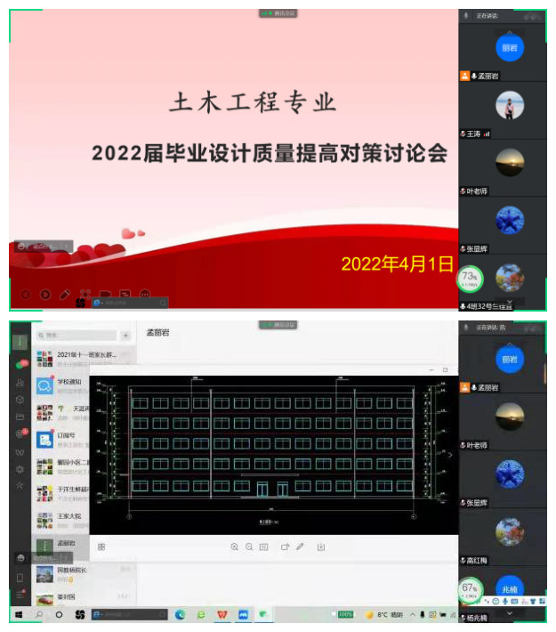 针对本学期毕业设计指导工作可能面临的种种困难,土木工程专业全体毕业设计指导教师利用腾讯会议线上召开了2022届毕业设计质量提高对策讨论会。全体教师针对毕业设计选题、毕业设计日常指导、过程考核过程中出现的问题进行了商讨,群策群力,制定了疫情常态化情况下毕业设计指导制度和学生毕业设计过程考核方法。明确了线上教学期间教师的集中指导时间、指导形式以及定期组织毕业设计小组开会要求。集中指导采取学生汇报答辩的方式,避免毕业设计指导流于普通答疑形式。同时,这样也便于指导教师对学生的出勤、毕业设计成果质量、设计进度等实现全过程管理和监督。