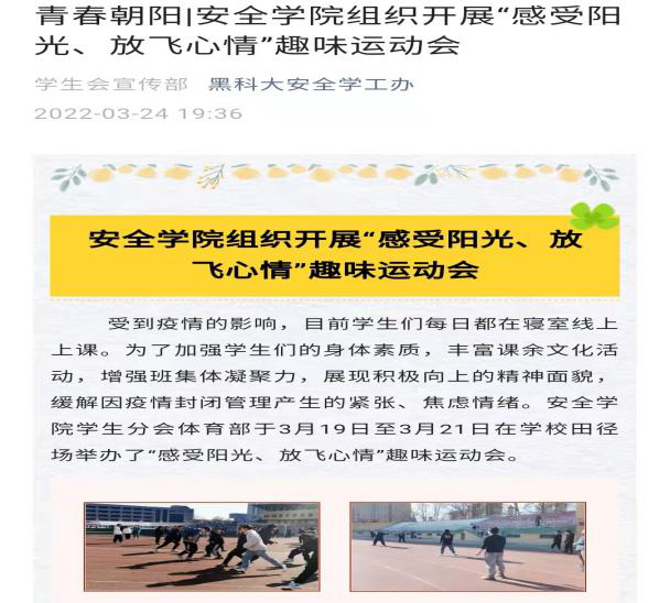 学院以“3.25善爱我”心理健康活动月为契机,举办了“幸福传递”心理健康知识宣传展板评比、“快乐生活 向阳逐梦”心理情景剧大赛、“感受阳光、放飞心情”趣味运动会,丰富的心理健康校园文化活动,让学生在拓展对自身心理认知的同时,促进交流、协同合作、分享快乐、缓解压力,调节紧张的情绪。