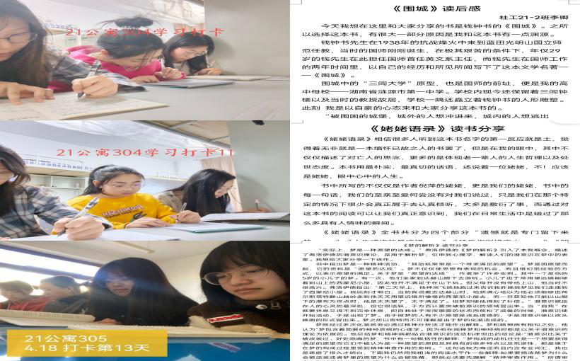 一、拓展专业知识,激发学习动力。开展“乐学不停步 蓄能在云端”宿舍学习打卡活动,以寝室为基础,在“云端”为学生搭建线上交流监督平台,营造良好的学习氛围;开展“共享书香 不负时光”读书分享会,利用文字从不同角度畅谈所思、所想、所感、所悟,鼓励学生从书中汲取营养,营造热爱阅读、崇尚阅读的良好学习氛围。