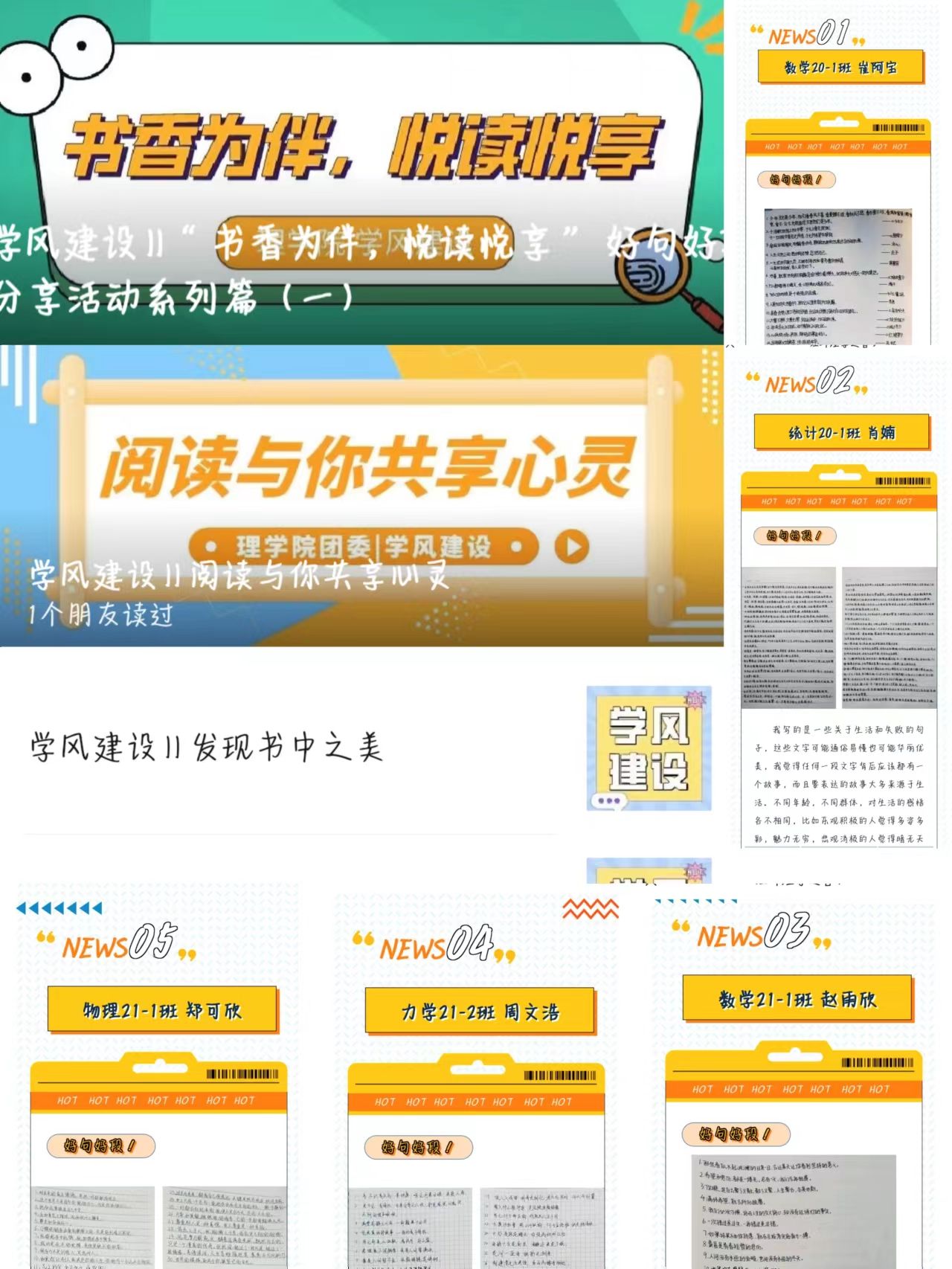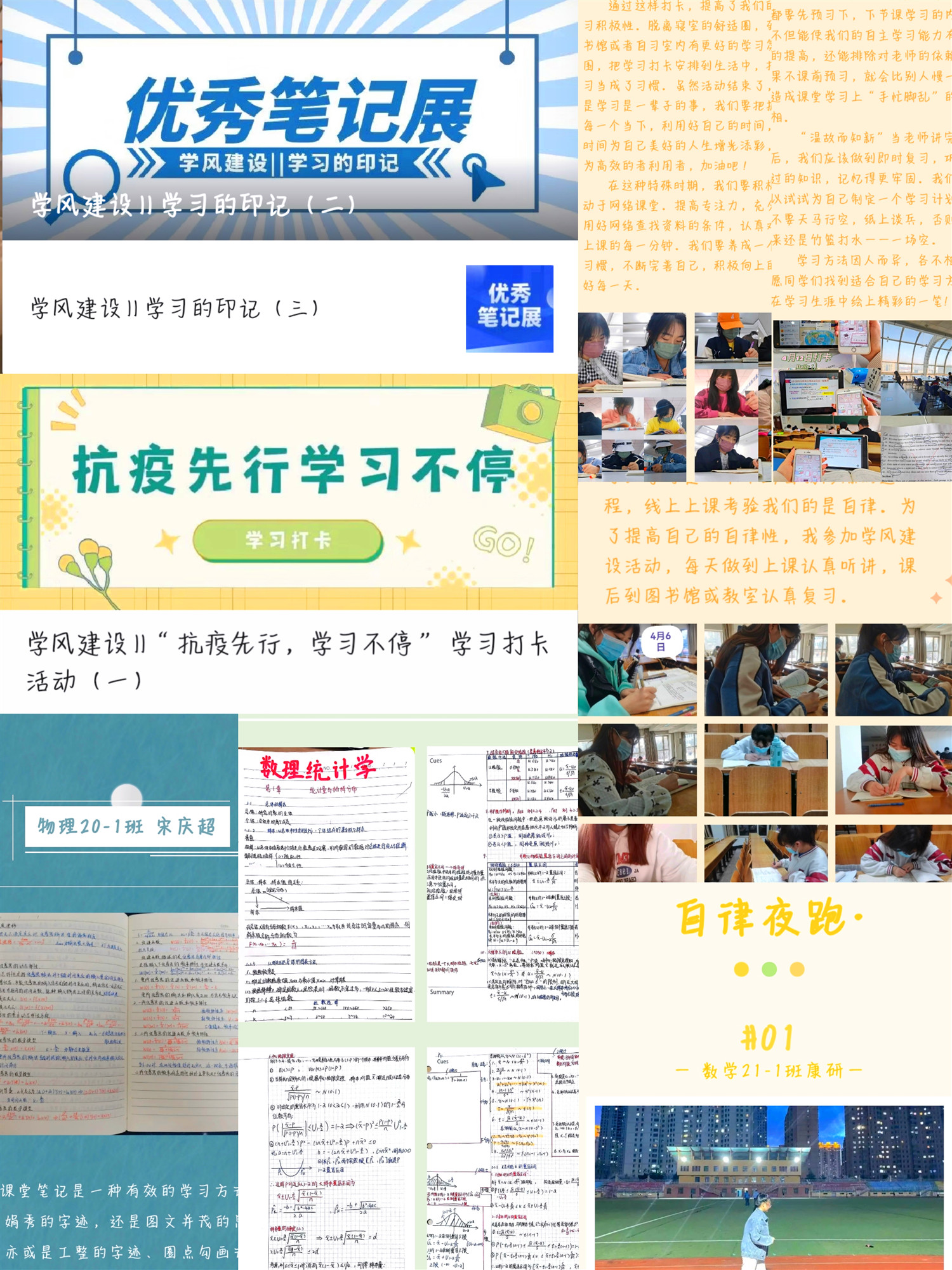 学院注重学生对于读书文化的实际体验,强调培育优良学风要源于书中,更要回归生活。开展“发现书中之美”活动,引导学生体验书中之美;开展“最美学习笔记”评选活动,甄选最佳的笔记范本;开展“21天学习打卡活动”,让学生养成好的学习习惯;开展“运动战疫,自律夜跑”活动,磨练学生意志品质、强健体魄;开展考研经验分享活动,助力学生实现考研梦想;开展学生榜样引领活动,通过典型引领学生成长;开展学科学术竞赛,搭建创新创业平台……