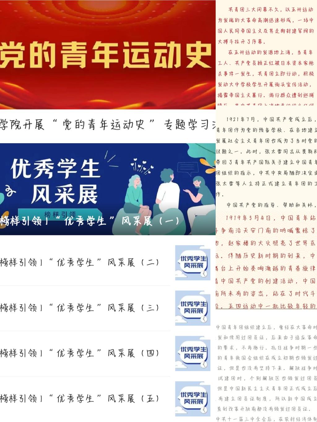 为迎接庆祝中国共青团成立100周年,学院把团史学习融入学风建设活动中,打造“百年青年运动史阅读会”。以《中国共青团史稿》《党领导中国青年运动的光辉历程》等书籍为载体,通过阅读感悟征集、篇章朗读、分享与推荐等环节,深刻领悟百年团史中,中国共产党科学把握青年运动的规律。学院在先学一步、学深一层的基础上,组织青年团员学习研讨,让他们迅速投入到学习党的青年运动史学习热潮中去,开展“百年团史——经典诵读活动”,通过诵读活动,深刻领悟党领导中国青年运动的光辉历程、重大成就和历史经验,引导青年团员们进一步坚定理想信念。