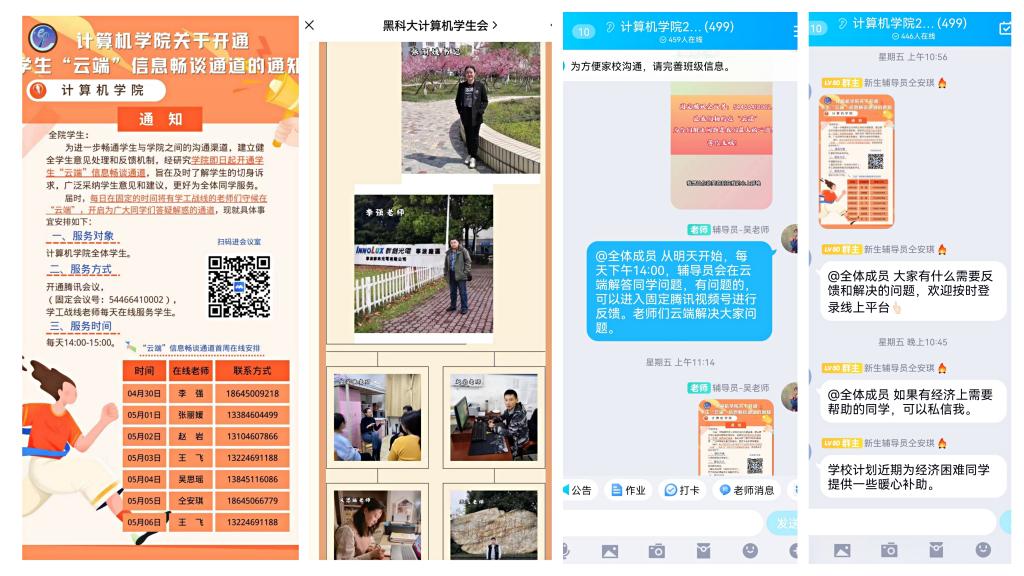 5月1日—7日计算机学院分年级组织召开心理恳谈会,恳谈由各年级辅导员组织进行。同时,为了进一步畅通反馈渠道,帮助学生解决实际困难,学院开通了为期一周的学生“云端”信息畅谈通道,学院党委副书记张丽媛和全体辅导员每日轮流在线,帮助学生答疑解惑。
