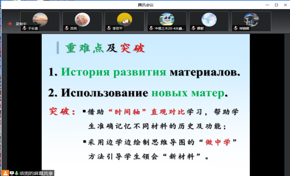 本次示范课的主讲教师项男是黑龙江大学博士、副教授、首届黑龙江省高校教师创新大赛二等奖获得者,俄语教学经验丰富。示范课的课程是《科技俄语阅读》,讲授内容是“История развития материалов——材料的发展史”。项男老师首先通过“中俄材料领域深度合作”的俄语新闻导入新课,激发学生学习的渴望;然后分为课前预习知识点拨、材料的概念及意义、材料演进的历史进程、认识新材料等板块进行讲解;接着通过判断、接续、问答等方式检验新知识掌握程度;最后,通过学生“理论与实践相结合”学习成果展示对知识进一步深化、巩固。整个教学过程秉承“学生为中心”的教学理念,紧紧围绕“俄语+”应用型人才培养的目标,遵循线上、线下深度融合的策略,使导学、自学、自测、互学、展示、拓展有机结合,主要运用启发式、体验式、对比法、实践法等方法着重培养学生在“俄语+材料”领域的实践应用能力。最后通过“我们是服务社会的特殊材料,具有学习过程的不可重复性”的对比,引导学生珍惜时光、努力学习、立足“俄语+”领域为中华民族伟大复兴贡献力量。