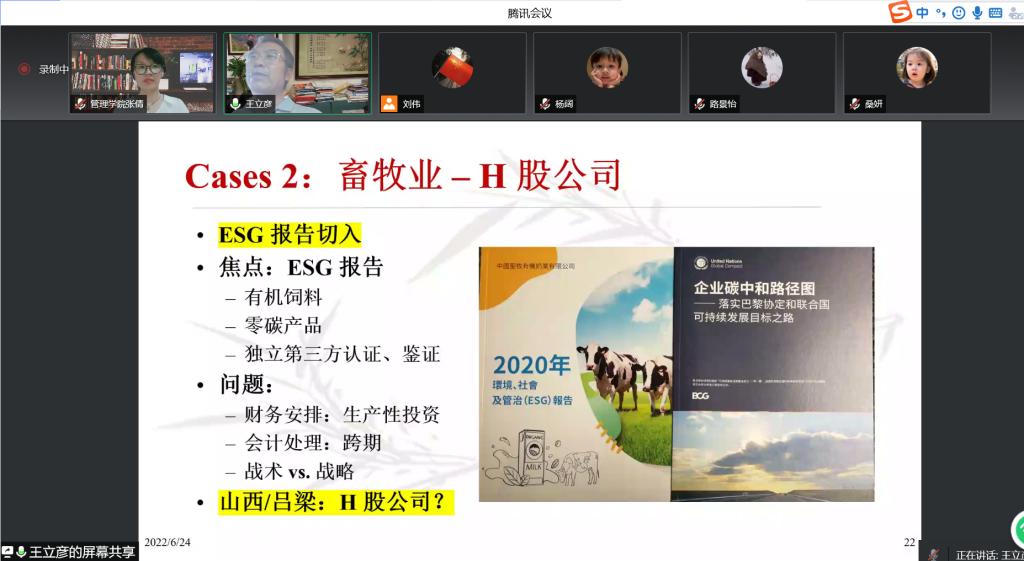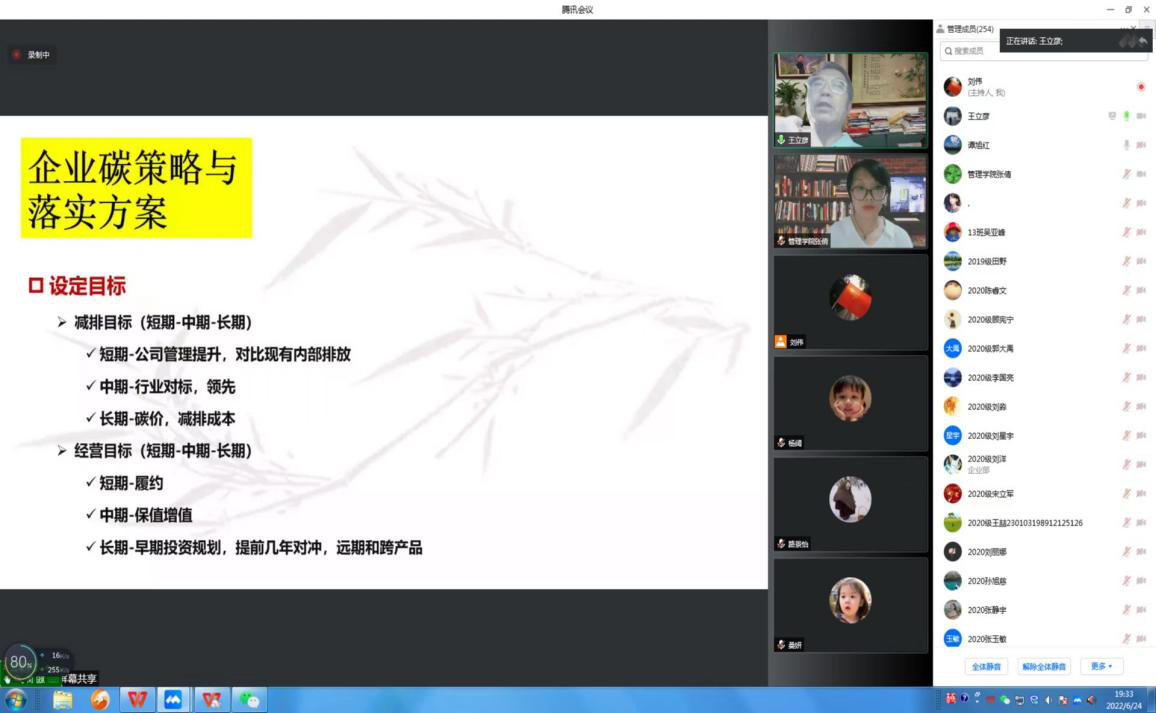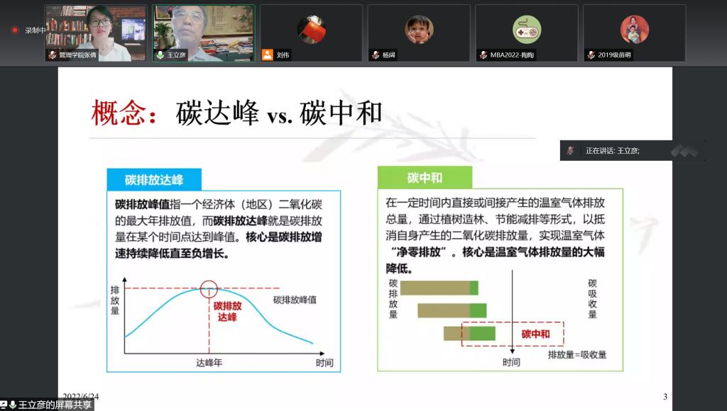 为了加强学术交流,营造浓厚学术氛围,开阔师生学术视野,促进学科发展,6月24日,由科技处、管理学院联合举办的“管理学院2022年专场学术报告会”第二场,邀请到北京大学光华管理学院教授、博士生导师王立彦作了题为《企业管理助力实现“30-60”双碳目标》的学术报告。报告会由管理学院副院长张倩主持,管理学院及其他院系相关研究领域的师生260余人参加了本次报告会和学术交流活动。
