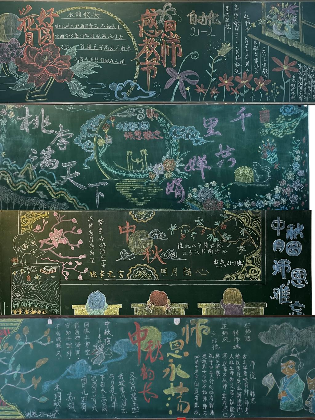 开展“一寸月光、三尺讲台”主题板报大赛。同学们接过老师手中的粉笔,用构思巧妙、寓意深远的板报进一步感谢老师们的辛勤付出和谆谆教诲,用粉笔记录中秋月圆、感恩教师的真切情谊。