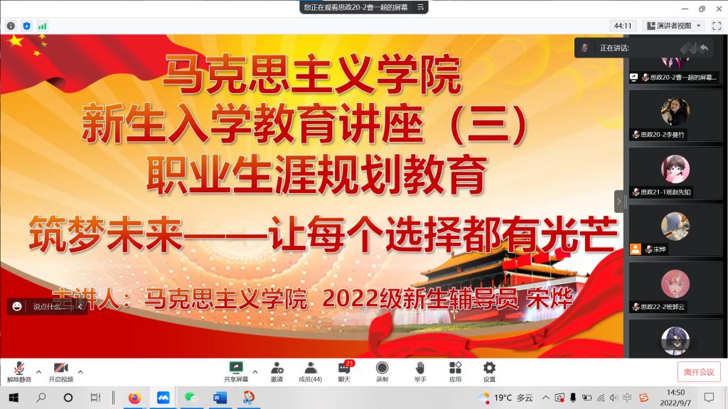 一是开展专业认识教育。学院院长冯德军为2022级新生进行了思想政治教育专业介绍,从专业教育培养方案、发展方向、就业前景等方面详细解读,帮助学生了解专业发展动态,强化专业认同感,坚定学生专业学习信心,激发学生专业学习的兴趣与动力。二是开展职业生涯规划教育。辅导员宋烨以“筑梦未来——让每个选择都有光芒”为题,唤醒新生对职业生涯规划重要性的认知,让学生明确职业发展目标与职业理想,培养学生积极向上的人生态度和良好的就业、择业观念。三是开展奖助学金评审管理方法解读会。为新生讲解《幻影手机官方网站_幻影(中国)本科生各级各类奖学金评审管理方法》,加深新生对幻影手机官方网站_幻影(中国)奖助政策的了解,引导2022级新生锐意进取,营造了良好的学风氛围。