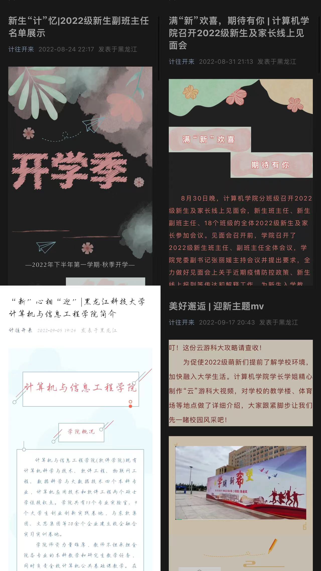 为加强学院与2022级新生间联系互动,学院通过“计往开来”微信公众平台“满‘新’欢喜,期待有你”板块发布学院简介、副班任介绍及迎新主题MV。旨在帮助2022级新生更快了解校园并融入大学生活;8月30日晚,计算机学院分班级召开2022级新生及家长线上见面会,深入推进了家校联动机制,进一步拉近学院老师与新生及家长之间的距离,助力学生全面成长。