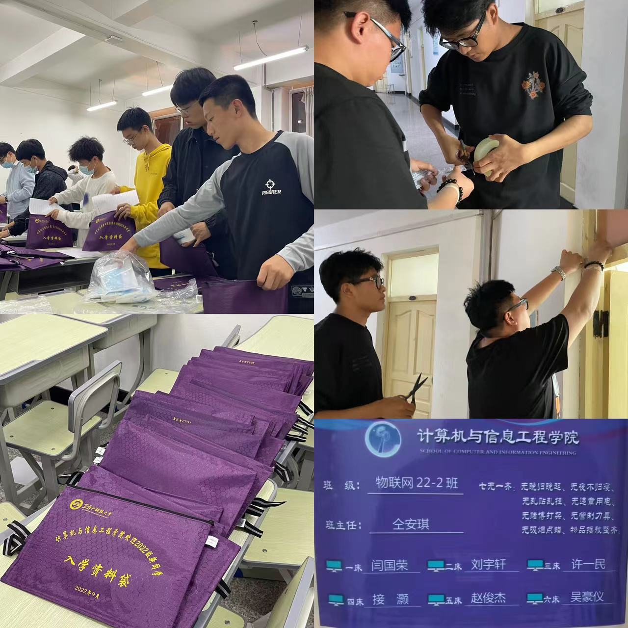 为稳步落实迎新部署的相关要求,营造浓郁的迎新氛围。学院悉心准备、细心布置,为每一位新生准备了寓意着“紫气东来”的爱心大礼包,将口罩、一卡通、辅导员联络卡等报到材料归纳整理,切实做好服务保障工作;学院精心设计了凝练学院特色文化的门贴、床贴,实现宿舍床位实名制,提升了宿舍管理的效能。学院设计制作迎新展板及优秀毕业生风采,具体地展示了学院的基本情况,促使新生更加详细了解学校具体情况;学院在宿舍区、迎新区拉起迎新条幅,进一步营造热情温馨的入学氛围。
