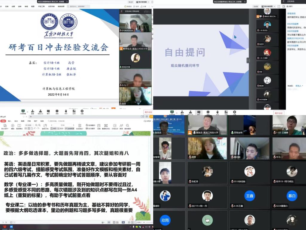 梦想“研”续,经验再分享。举行“拼搏百日,一‘研’为定”研考百日冲击经验交流分享会。特邀18级优秀毕业生,现就读于西南大学、山东科技大学以及本校马克思主义学院研究生为考研学生分享备考经验,并结合各专业进行系统分析,全方位讲解考研流程及注意事项,每一项都“干货”满满,参会同学们纷纷表示收获颇丰。
