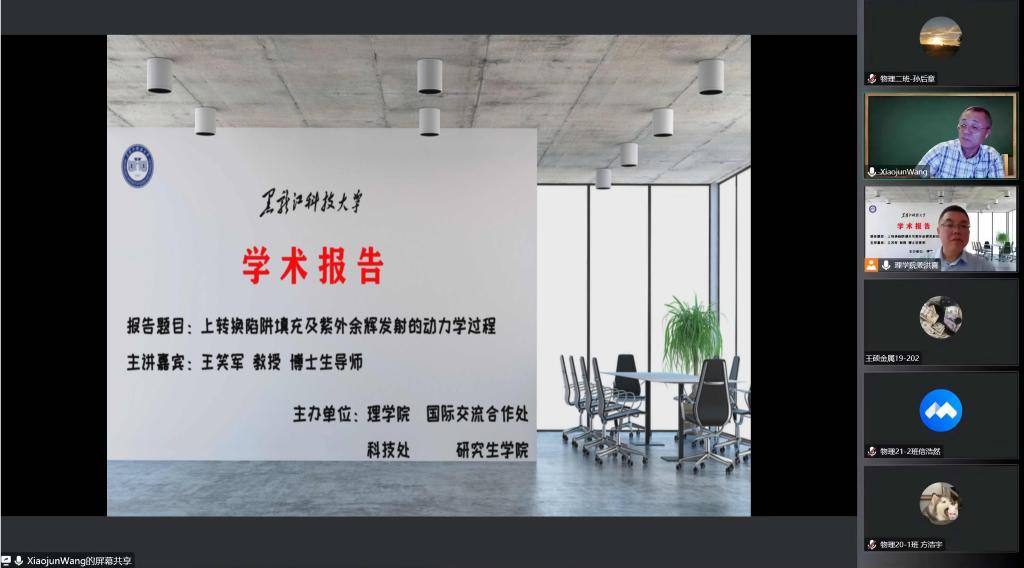 11月12日,应理学院邀请美国南佐治亚大学终身教授王笑军博士通过腾讯会议为理学院、材料学院和环化学院的部分本科生、硕士生和教师约300人做了题为“Dynamic Processes of Up-conversion Charging and Persistent UV Emissions”的学术报告。王教授研究领域为荧光材料的光学性质,激光光谱,激发光动力学过程。曾担任东北师范大学,吉林大学,中科院长春光机所的客座教授。现为Nature出版集团Light:Science & Applications编辑,Elsevier出版集团Materials Research Bulletin副主编,及Journal of Rare Earths,发光学报和中国光学等杂志编委。会议由物理学科带头人副院长姜洪喜主持。
