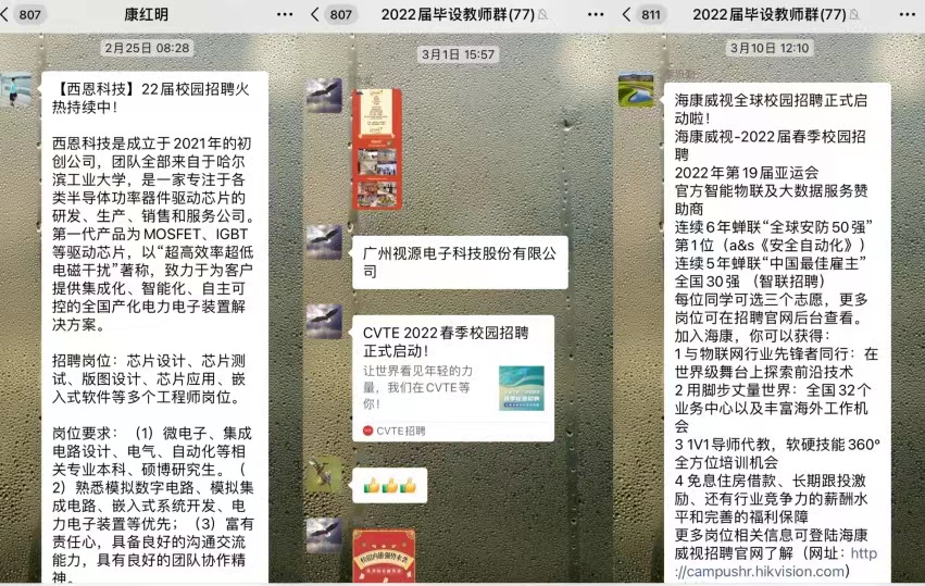 从去年11月份以来,针对2022届毕业生就业工作采取线上招聘,创新方式方法、实施多措并举,以开启“1234”就业工作模式为前提,努力推动毕业生实现稳步就业,有效保证了疫情防控期间毕业生就业工作的质量和成效。尤其是春招以来累计精准发布就业信息百余条,精准对接对口用人单位三十多家,精准推荐58人,精准指导学生147人次,辅导员与12名志愿者精准做好就业信息的筛选和求职简历的投递。