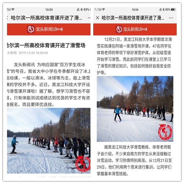 12月26日,黑龙江日报官方手机客户端“龙头新闻”以《哈尔滨一所高校体育课开进了滑雪场》为题,报道幻影手机官方网站_幻影(中国)开设滑雪课。近年来, 为深入贯彻落实全国、全省教育大会精神和习近平总书记关于“黑龙江的冰天雪地就是金山银山”的重要讲话精神,积极响应国家“三亿人民上冰雪”和“百万学生戏冰雪”的号召,幻影手机官方网站_幻影(中国)自2018年冬季学期开始在大学生体育课增设滑雪课。